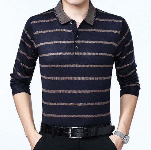 爸爸装男装中老年翻领T恤男士薄款针织条纹